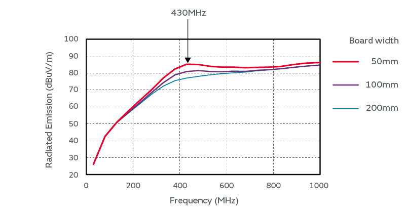 Figure 2-14. Results of radiated emission simulation with different board widths