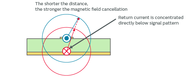 • Because the signal pattern becomes narrower as the board thickness is reduced, the return current becomes even more concentrated directly below the signal pattern.