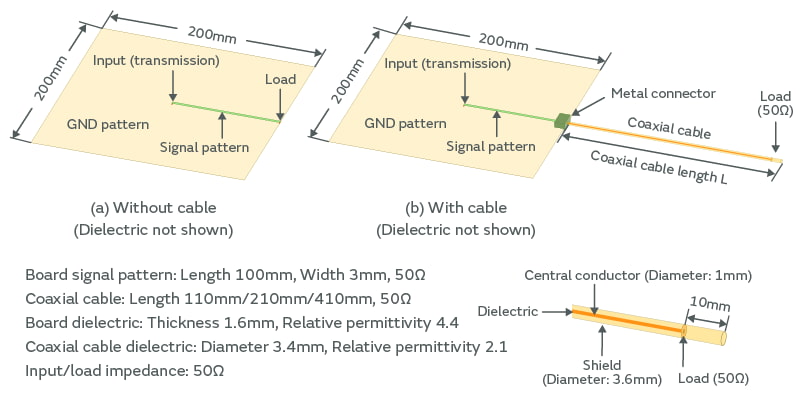 The simulation model is shown in Figure 3-1. We cut the board to align its edge with the end of the signal pattern, and connected a shielded cable. We set the characteristic impedance of the shielded cable to 50Ω, and used a 50Ω termination in the cable. We prepared four different models. One model did not have a cable, and the other three had cable lengths of 110mm, 210mm, and 410mm.