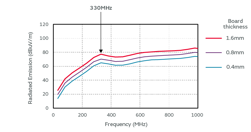 Figure 3-5. Results of radiated emission simulation with different board thicknesses