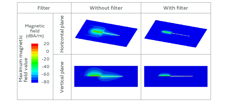 As you can see, the radiated emission decreased. The magnetic field distribution also shows a decrease in the noise generated by the board, as well as the noise propagated to the shielded cable. In other words, reducing the thickness of the board is also effective at suppressing the noise that propagates to and radiates from the cable shield.