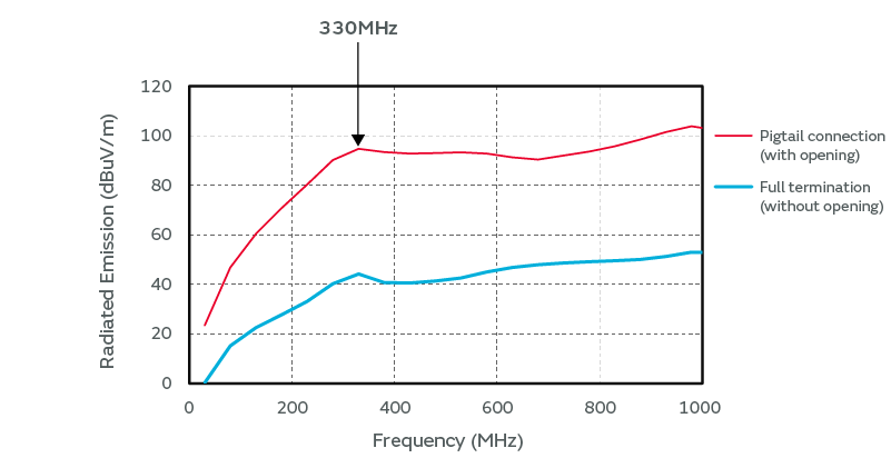 These results demonstrate that using a pigtail connection increases the radiated emission due to noise leaking from the slit. It is necessary to use a cable that its shield is fully terminated to the metal connector.