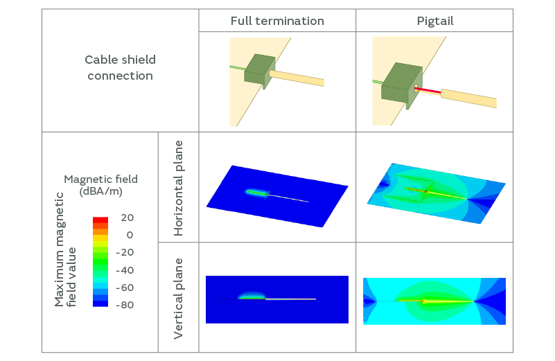 The proper shielding effect is achieved when the entire perimeter of the cable shield is in full termination with the metal connector. However, when using a pigtail connection with metal wire, the shielding effect is reduced because a slit is formed. Noise leaks from the slit and propagates to the shield and board, thereby amplifying the radiated emission. Here, we will present the results of the simulation conducted to visualize this phenomenon.