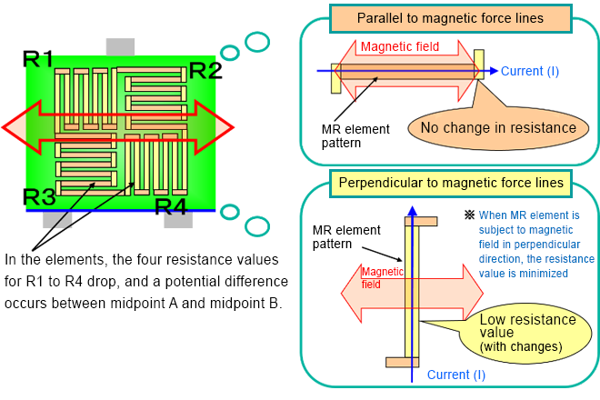 In a magnetoresistive element, the resistance changes when a magnetic field is applied perpendicular to the electrical current direction. AMR sensors have a wide range of placement patterns as shown in the figure, and they consist of a combination of elements that change the resistance (R1, R4) and elements that do not change the resistance (R2, R3).