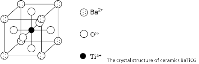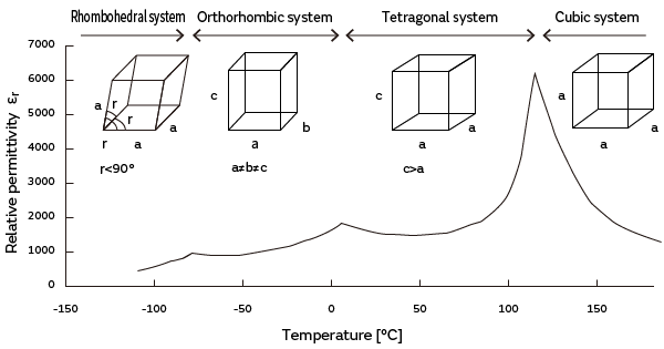 At the Curie temperature (approx 125°C) or more, it has a cubic crystal structure, and below the Curie temperature and within an ambient temperature range, one axis (axis C) stretches and the other axes shrink and turn into a tetragonal crystal structure.