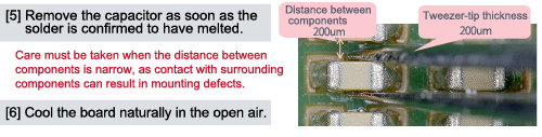 When removing a capacitor from a high-density mounted board, it is recommended to use precision tweezers with a tip thickness of 0.1 mm or less to avoid contact with surrounding components.