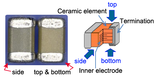The color of the ceramic element seems different between the top, bottom, and sides due to the transparency degree of the internal electrode.