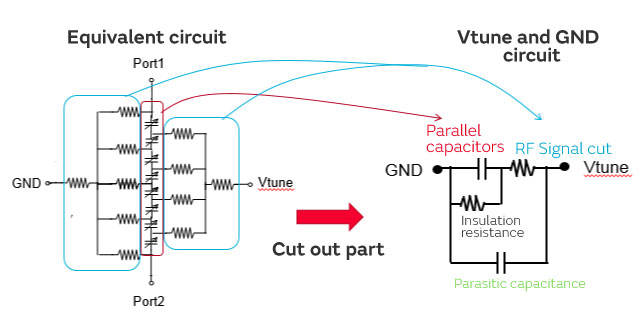 The capacitance between VTune and GND is 12.8 nf * and parasitic capacitance is about 0.5 pf.