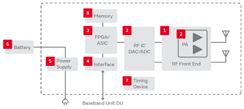 基地局を構成するベースバンド装置(BBU: Baseband Unit)とリモート無線装置(RRU: Remote Radio Unit)のうち、ミリ波以外のリモート無線装置向けの製品ラインアップをご紹介します。