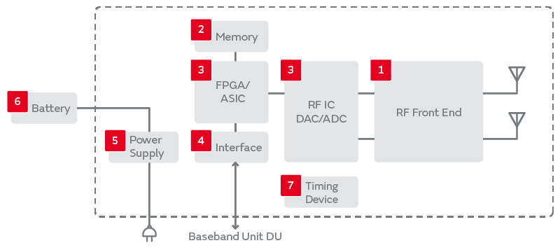 基地局を構成するベースバンド装置(BBU: Baseband Unit)とリモート無線装置(RRU: Remote Radio Unit)のうち、ミリ波のリモート無線装置向けの製品ラインアップをご紹介します。