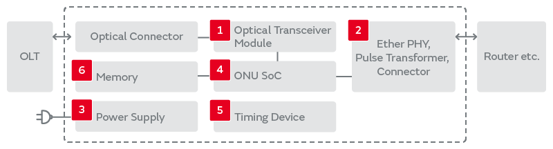 G-PON(Gigabit passive optical network:ギガビット受動光ネットワーク)を構成するOLT(Optical Line Terminal:光回線終端装置)とONU(Optical Network Unit : 光ネットワーク装置)のうち、ONU向けの製品ラインアップをご紹介します。