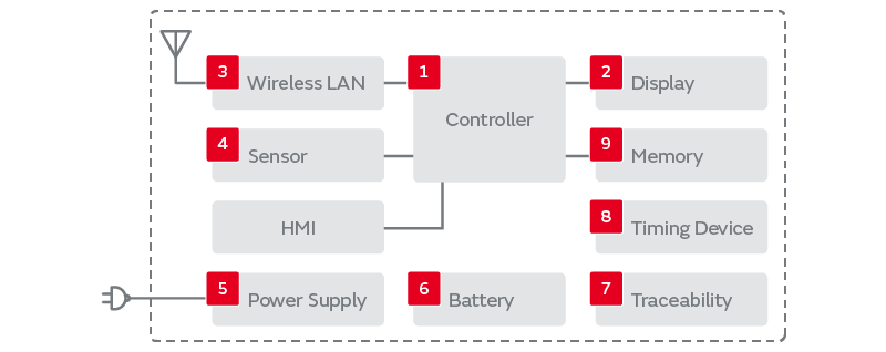 サーモスタット(Thermostat)には、さまざまな省エネルギー技術が使われています。ムラタは各種コンデンサ、ノイズ対策部品、サーミスタ他、WiFi、Sub-GHzモジュール等の無線通信モジュールやセンサ等により、これらの開発に貢献します。