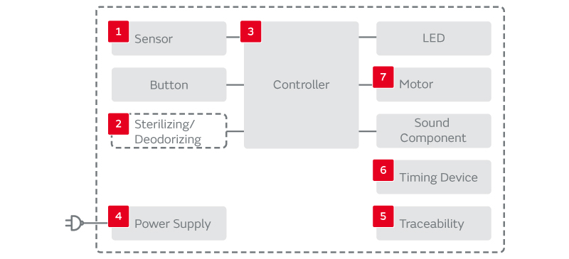 空調機器や冷蔵庫・洗濯機など、日々の暮らしで使う家電製品には、より一層の省エネルギーと環境・健康への配慮が求められています。ムラタは、低損失で長寿命なセラミックコンデンサや変換効率の高い電源モジュールで省エネルギー化に貢献。スマート家電では、空気浄化を行うイオナイザモジュールや殺菌・消臭・野菜などの鮮度保存&栄養UPを行うオゾナイザモジュールに加え、各種センサ、無線通信モジュール、マイコン周辺部品などで、人と地球に優しい家電を支えます。