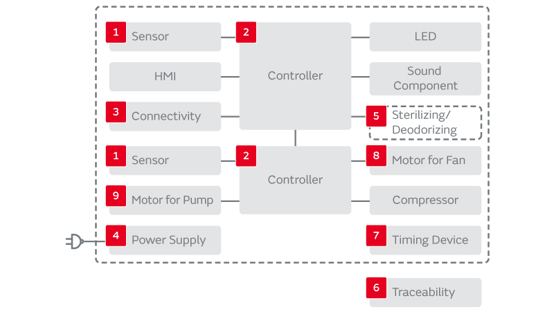 空調機器や冷蔵庫・洗濯機など、日々の暮らしで使う家電製品には、より一層の省エネルギーと環境・健康への配慮が求められています。ムラタは、低損失で長寿命なセラミックコンデンサや変換効率の高い電源モジュールで省エネルギー化に貢献します。スマート家電では、空気浄化を行うイオナイザモジュールや殺菌・消臭・野菜などの鮮度保存&栄養UPを行うオゾナイザモジュールに加え、各種センサ、無線通信モジュール、マイコン周辺部品などで、人と地球に優しい家電を支えます。