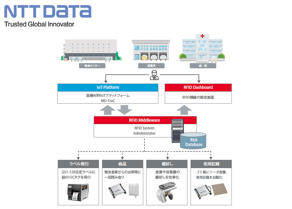 医療材料のサプライチェーンを可視化する流通管理システムである「MD-TraC」を株式会社NTTデータ様が2019年4月から販売開始しました。当社は「MD-TraC」とRFIDミドルウェアを連携し、医療機器メーカー様/ディーラー様/医療機関様へのRFID構築をサポートしています。2019年5月に医療機器に貼りつけるRFIDタグの通信周波数がUHF帯に決定され、当社のミドルウェアはGS1推奨フォーマットによる書き込みにも対応しています。今回はNTTデータ様にご協力を頂き、医療材料IoTプラットフォーム「MD-TraC」と当社RFIDミドルウェア「RFID System Administrator」を連携したデモンストレーションを通して、医療材料の管理を紹介いたします。