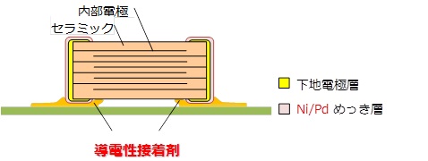 - 外部電極に新規開発したNi/Pd電極を採用しており、高温環境下においても導電性接着剤との高い接合信頼性を得ることができます。また、従来品(GCGシリーズ)に比べて端子電極の耐腐食性が優れています。