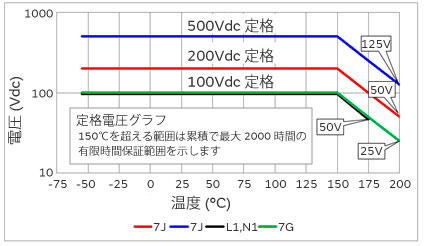 製品温度が150℃を超える場合は、以下のように定格電圧に対してコンデンサに印加される電圧を軽減してご使用ください。