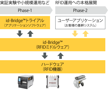 id-Bridge™は、当社で開発するRFIDミドルウェア※1 のウェブアプリケーションで、お客さまの基幹システムと各RFID機器(プリンタ、リーダライタなど)との間でデータ連携を行います。一般的に基幹システムとの連携を前提としたシステム構築には大規模な投資が必要となりますが、スタンドアロンで稼働可能なid-Bridge™は低価格でRFIDシステム導入による効果検証が可能です。また、導入後に基幹システムとの連携を希望される場合は、ミドルウェア内にデータ連携の追加インターフェースを開発することも可能です。なお、一般的な物流業務や物品の管理に必要とされる基本機能も備えており、医療分野以外の幅広い用途にも適応します。
