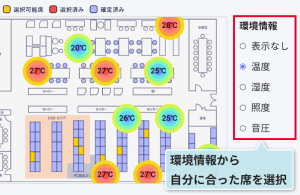そこで、当社の「センサデータプラットフォーム Pifaa(ピーファ)」を活用して、座席の使用状況を可視化するシステムを開発しました。本システムは、誰が今どこにいるのかを把握する座席管理に加えて、新たな交流を生むランダム配席機能や、その日の作業内容や気分に合わせて自分の働きたい環境を選択するのに役立つ環境情報表示機能(オプション機能)により、コミュニケーションの活性化や生産性の向上に貢献します。本製品は、利用席の記録に社員証を利用するため、二次元バーコードやビーコンでの管理と比べて低コストかつ少ない手間で導入可能です。