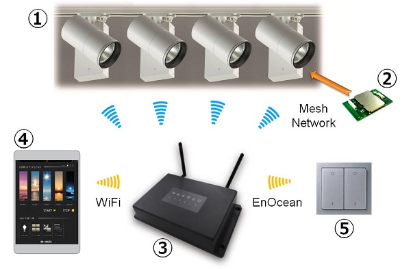 そこで当社は、照明器具1台ごとに無線モジュールを組み込んだ通信機能により、無線コントロールで個別に調色・調光を可能にするとともに、複数の照明器具全体を管理できる無線照明制御システムを開発いたしました。これにより、簡単な操作で個別の照明器具の調色・調光ができるようになり、きめ細かな空間演出が可能になります。また、照明制御配線の敷設が不要なため、照明設計の自由度を高めることができます。