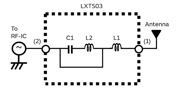 図1にRadisolの等価回路例を示します。当社独自の多層技術により、2つのコイルL1とL2を近傍配置させることで磁界結合させ、またショートパス間に相互インダクタンスが生じている構造となっています。この相互インダクタンスと、L2とC1が並列共振回路となり、不要電力の流入・干渉を抑えアンテナ特性を改善します。