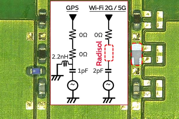 図4 Radisolを実装する前後のGPS / Wi-Fiアンテナのマッチング回路部