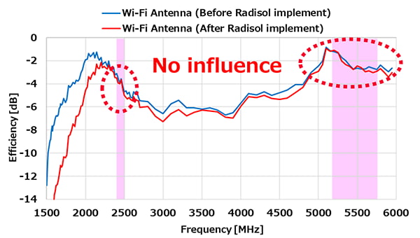 また、Radisolを実装してもWi-Fiアンテナの共振周波数への影響もないため、アンテナ特性に大きな劣化はみられません。