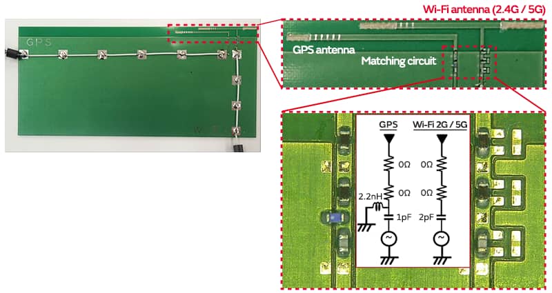 図3は、GPSアンテナ(1.5GHz)とWi-Fi™(2.4GHz / 5GHz)アンテナが近接に配置された評価基板です。