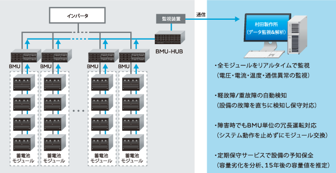 クラウド型遠隔監視により、全ての蓄電池モジュールをリアルタイムで監視し情報を蓄積することで、異常を早期に発見し最適な対応を行う事ができます。早期に最適な対応ができることで保守費用の低減にもつながります。