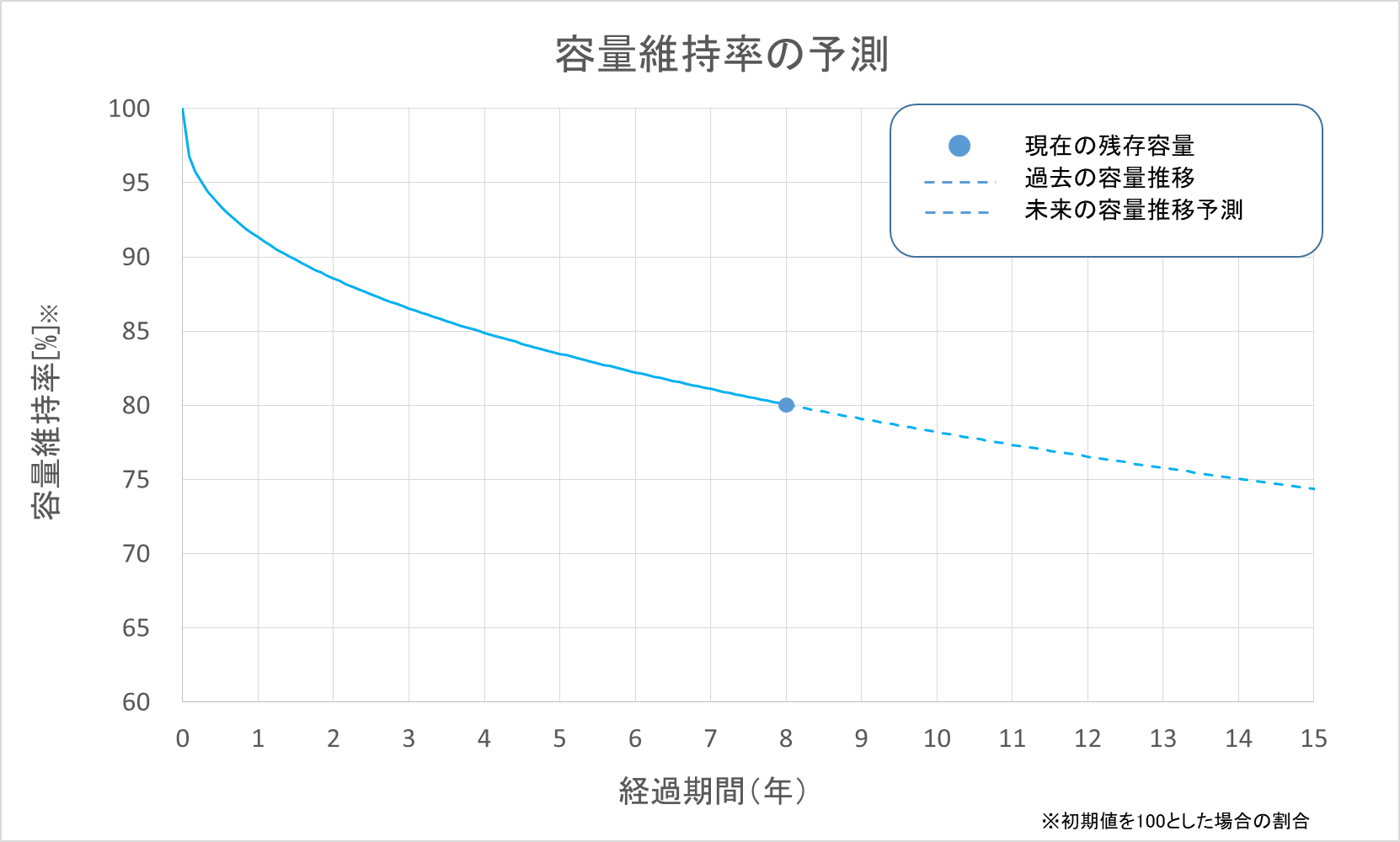 定期点検時に各蓄電池モジュールのデータを収集し弊社独自の劣化診断技術により各蓄電池モジュールの現在の残存容量と今後の容量推移を予測します。予測された残存容量が期待値を下回る場合には蓄電池設備の運用方法や設置環境について具体的な改善策を提案させていただきます。また、現在の残存容量がわかることで効果的なスケジュール運転が実施でき、蓄えたエネルギーの有効活用に貢献します。