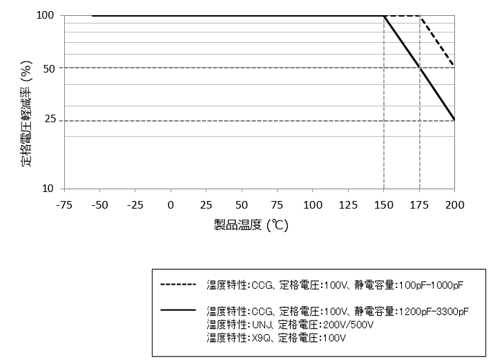 ディレーティング1 耐久性/高温負荷試験において、試験電圧が定格電圧×150%未満の製品になります。 ※通常積層セラミックコンデンサにおいても、ディレーティングを設定して使っていただいていると考えており、当製品においてのみ特殊にディレーティングの設定は行っておりません。