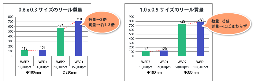 1リールの数量が倍以上に増えても、重さはほとんど変わらないため、輸送効率がアップします。