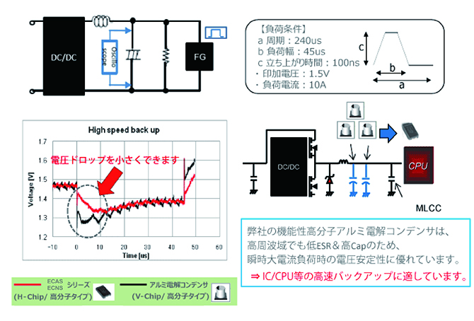 ECASシリーズは低ESR、低インピーダンス、静電容量が安定しているため、負荷電流が大きく変動が激しいCPUなどの各種電源ラインの平滑(リップル吸収や過渡応答)用途に最適です。基本的にMLCCと組み合わせて使われる場合がほとんどで、ECASシリーズは特に電圧変動抑制(高速バックアップ)用途で能力を発揮します。