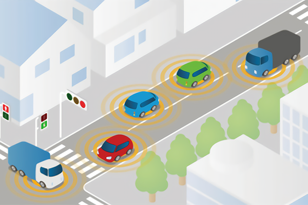 自動車と自動車(V2V:Vehicle to Vehicle)、または自動車と信号機などのインフラ(V2I:Vehicle to Infrastructure)が直接通信することで、衝突などの事故の防止および効率的な交通システムの構築を目的としており、将来的には完全自動運転につながる重要な技術になると予測されています。