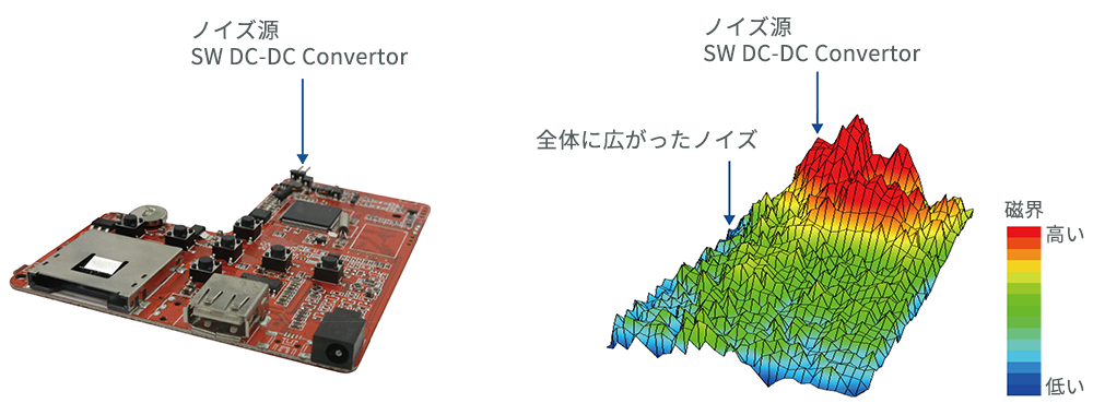 ノイズ対策においてノイズの分布をEMIプローブで観測すると、基板全体のノイズが高く、状況がつかめないときがあります。EMIプローブの分解能が悪いと考えるかもしれませんが、そのようなときは、ノイズが基板全体に広がっていることが多いです。さらに、基板上のノイズは基板に接続されたケーブルにも伝搬し広がっていきます。