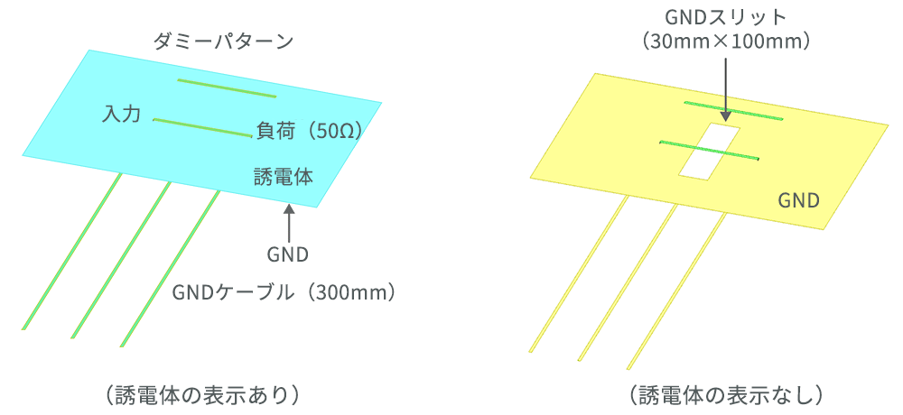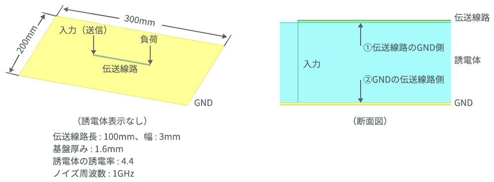 ノイズ電流は、基板条件が変わると、伝搬のしかたが変化し、ノイズ状況が変わります。その例として、伝送線路直下のGNDにスリットを設けた場合の磁界をシミュレーションした結果を紹介します。シミュレーションモデルを図4-1に示します 。なお、誘電体にはスリットを設けていません。