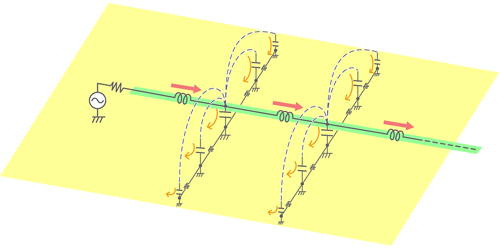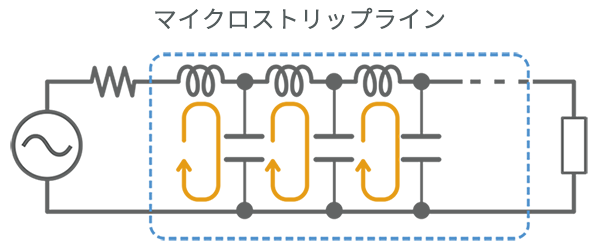 本文では図1-1に示すように、電流は分布的に存在するLやCを流れて伝搬することを紹介しました。