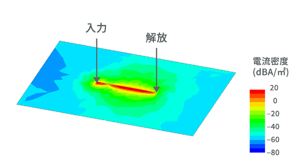 ここでは、電流が負荷を流れるループがなくても、分布的に存在するLやCを流れる様子をわかりやすく見ていただくために、負荷条件を開放としたときの電流密度のシミュレーション結果を示します(図2-4)。