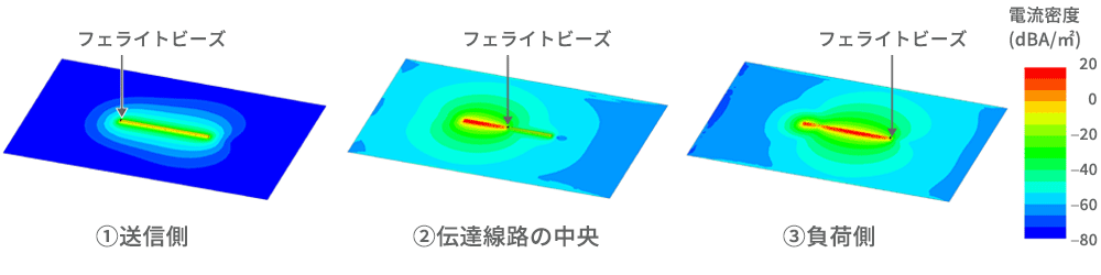フェライトビーズを、①送信側、②伝送線路の中央、③負荷側とした場合でシミュレーションしました(図2-6)。
