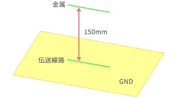 マイクロストリップライン上の空間に、伝送線路と同様の金属を配置して(図3-2)、磁界分布をシミュレーションしました。基板上部のプラスチックケースに補強用の金属が設けられていたり、放熱板などの金属が存在したりする場合を想定しています。