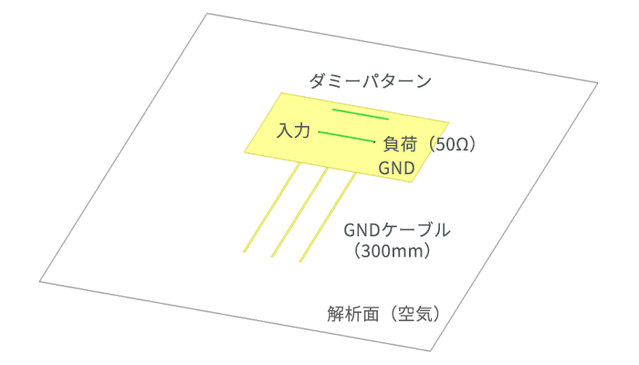 これを確認するために、図3-4に示したように、基板上に信号の入力がないダミーのパターン(ダミーパターン)や、GNDケーブルを追加し、磁界分布をシミュレーションしました。なお、基板上だけでなく、周囲の空気も解析面としています。
