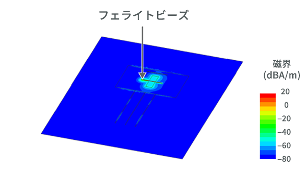 最後に、伝送線路に入力されたノイズ電流が、基板やケーブルに伝搬していたノイズの原因であることを示すために、伝送線路にフェライトビーズを挿入しました。そのときの磁界のシミュレーション結果を図4-3に示します。
