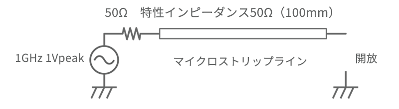 信号波形をシミュレーションした伝送線路のモデルを図1-3に示します。信号源の出力インピーダンスと信号インピーダンスは、50Ωで整合させています。ただし、負荷は開放としています。