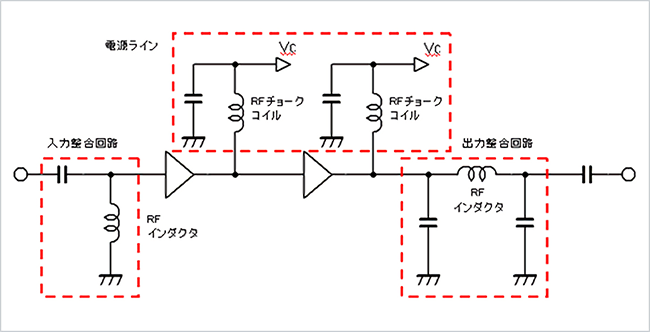 図1に、PAの回路例を示します。PAは1段では要求される出力パワーを満たすことが難しいため、通常は多段構成とします。図1ではPAが2段構成となっていますが、携帯電話の通信方式によって要求される出力パワーが異なりますので、対応する通信方式によりPAの構成を変える必要があります。例えば、UMTSよりGSMのほうが出力パワーの要求が大きいので、UMTSでは2段構成、GSMでは3段構成とする場合が多いと思われます。