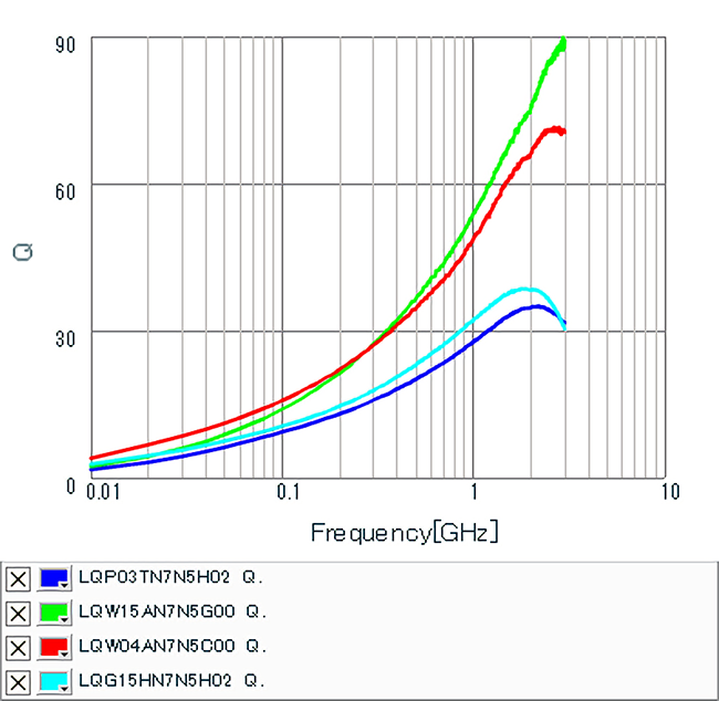 以上より、SAWフィルタの整合回路のRFインダクタは、Q特性・偏差・サイズ、そしてコストなどを比較検討し、選択する必要があります。実装スペースに余裕がある場合、高いQ値を有する巻線インダクタのLQW15/LQW04が最適です。一方で実装スペースに制約が生じる場合は、小型0603サイズにおいて高いQ値を有するLQP03HQ/LQP03TN_02が最適になります。