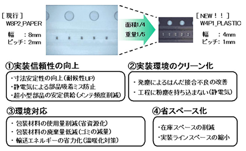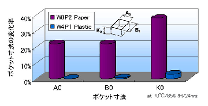 しかし、紙テープの場合、輸送時や保管時の湿度変化によりキャビティ寸法が変化するという問題がありました。部品サイズが小型になればなるほどその影響は大きくなり、狭隣接実装や高信頼性実装面で本来の実装品質が得られなくなる危険性が指摘されていました。
