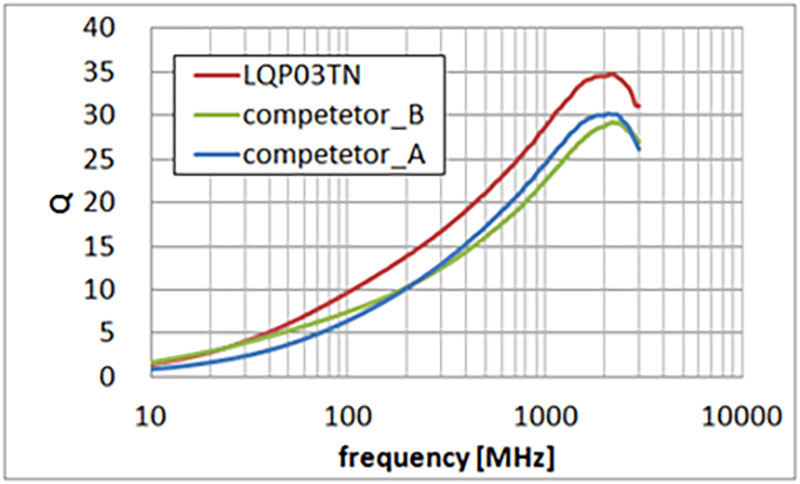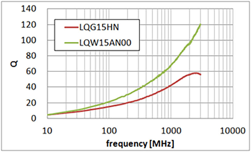 巻き線タイプLQWシリーズは、Q値が高いことが特徴です。Q値が高ければ、フィルタの通過帯域内の減衰特性が良好になるためRF部のマッチング回路に使われます。また、アンテナの送受信感度を保つためにアンテナのマッチング用途にも多く使われます。加えて、低Rdc特性を持つことから、大きな電流が流れるチョーク回路にも使われます。