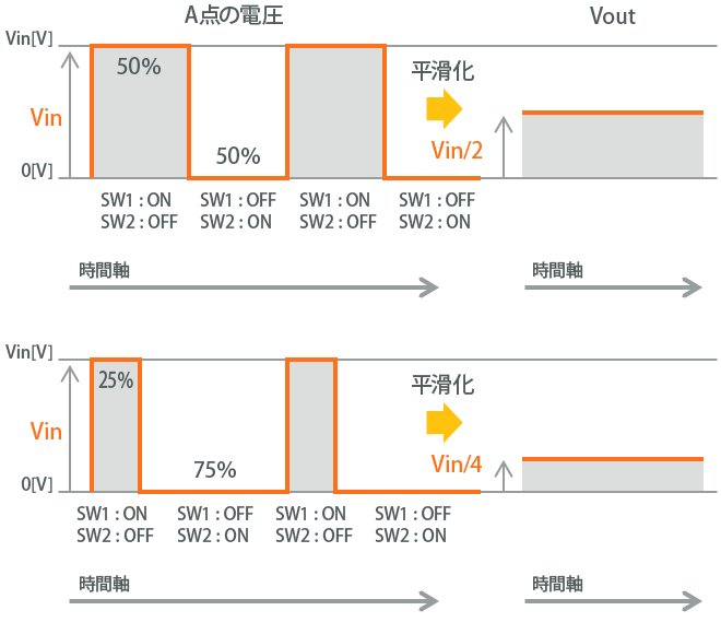 図2-5-3にスイッチング動作時のA点電圧とVoutの関係を示します。上図はSW1のON時間が全体の50%、すなわちDuty比が50%の場合です。このときの電圧を平滑化することで、Vinの50%となるVin/2が出力電圧Voutとして出力されます。下図はDuty比が25%の場合です。 Vinの25%となるVin/4が出力電圧Voutとして出力されます。 つまり、出力電圧が高い場合はDuty比は高くなり、出力電圧が低い場合はDuty比も低くなります。このようにスイッチングレギュレータでは、スイッチングのDuty比を変更することで、様々な電圧値を制御して出力することができるのです。