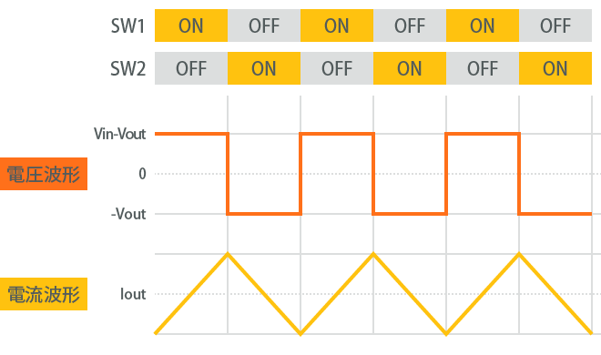 SW1がON、SW2がOFFとなった時、パワーインダクタには入力電源からの電圧がそのまま供給されるため、A点の電位はVinと等しくなります。次にSW1がOFF、SW2がONとなった時、パワーインダクタは入力電源から切り離されてGNDに接続されます。そのため、A点の電位はGNDと等しくなります。