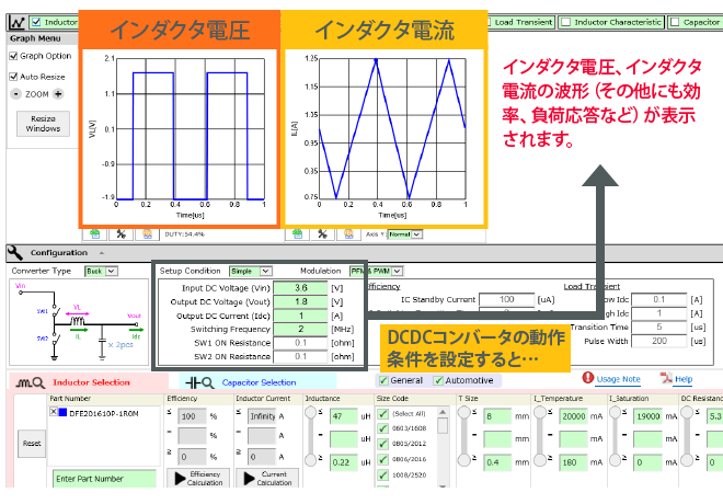 弊社が公開しているwebツールのひとつに「DC-DCコンバータ設計支援ツール」があります。DC-DCコンバータの動作条件に適したパワーインダクタや積層セラミックコンデンサを選定することができるツールです。本ツールを利用して、各種パラメータがDC-DCコンバータの動作にどのような影響を与えるのかみていきます。